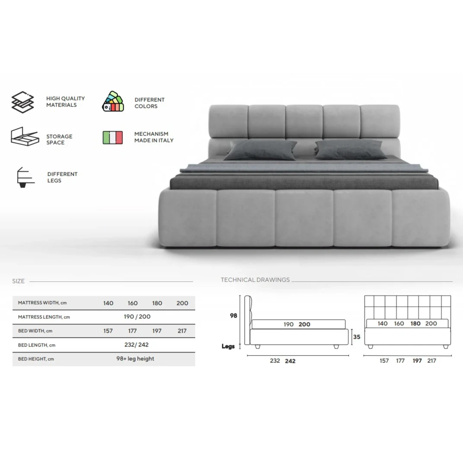 - Patul vine cu picioare standard Chrome de 5/8/10 cm (cilindrice din metal argintiu). Alte optiuni sunt contra cost.