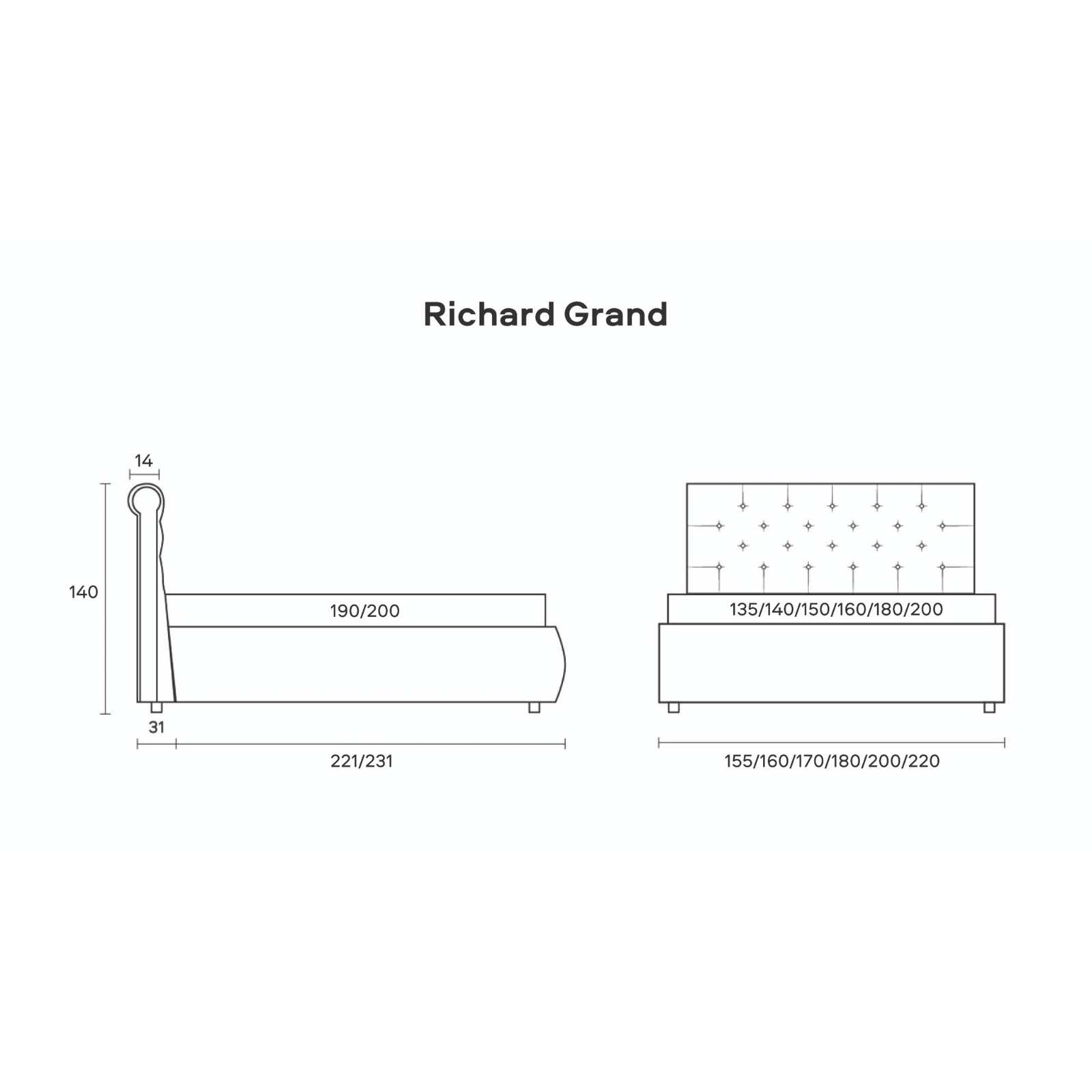 Patul Richard Grand combină în designul sau eleganța și rigoarea. Tăblia înaltă (cu 30 cm mai mult decât in cazul patului Richard) atrage atenția prin simplitatea și claritatea liniilor cu aspect aristocratic. Acest pat va arăta ideal în orice tip de interior, atât clasic cât și în modern.