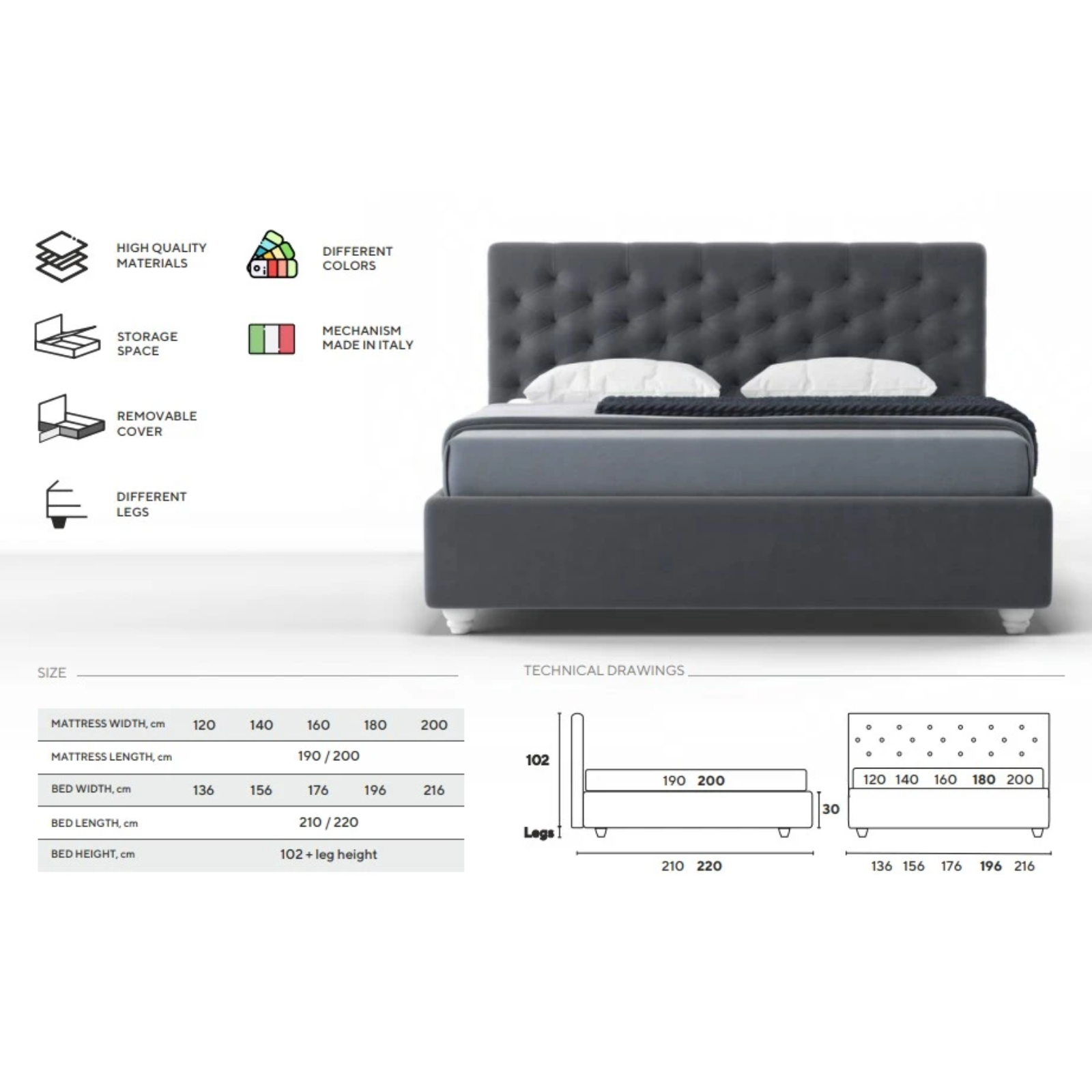 Lungime 190/200 - Adâncimea utilă a spațiului de depozitare: 15 cm;