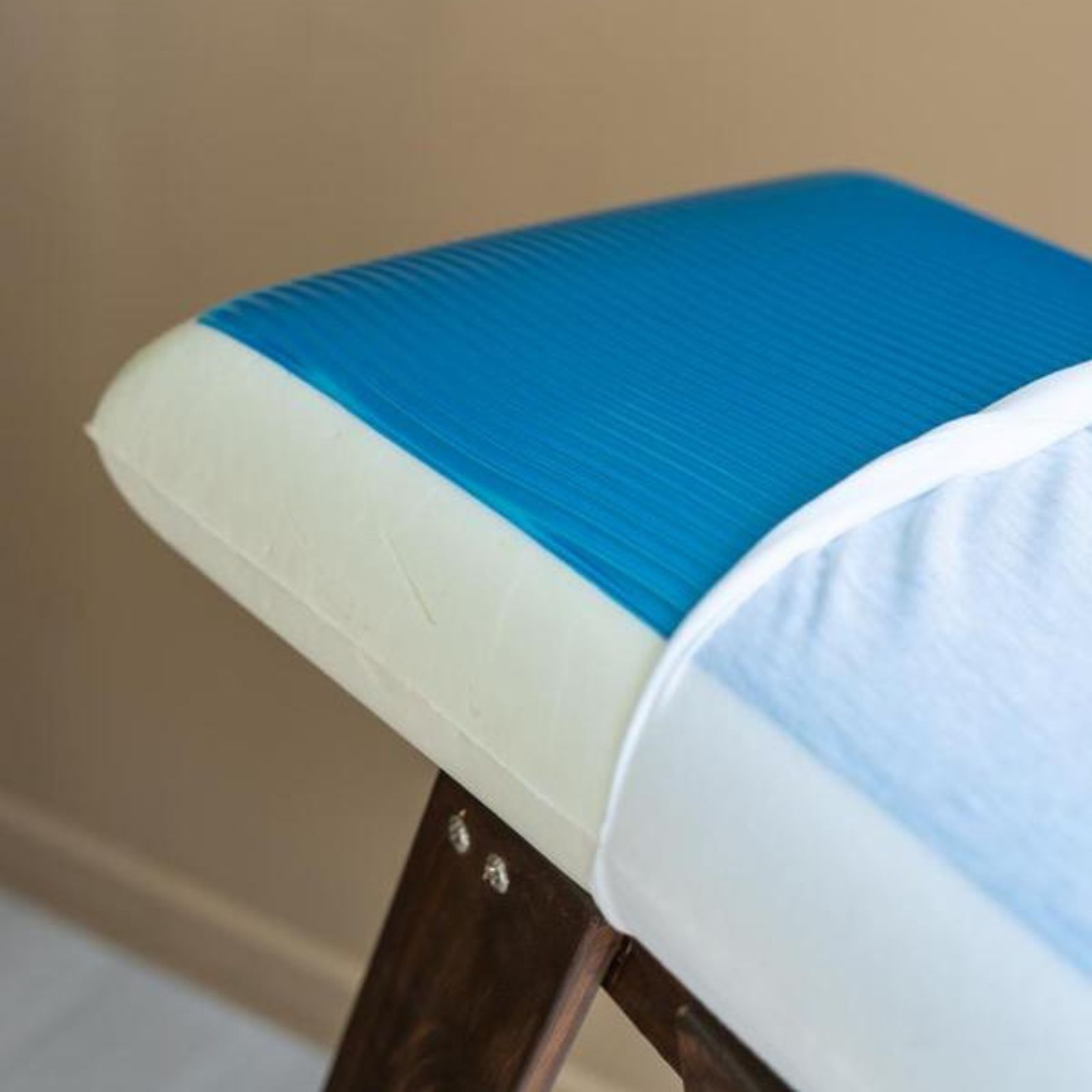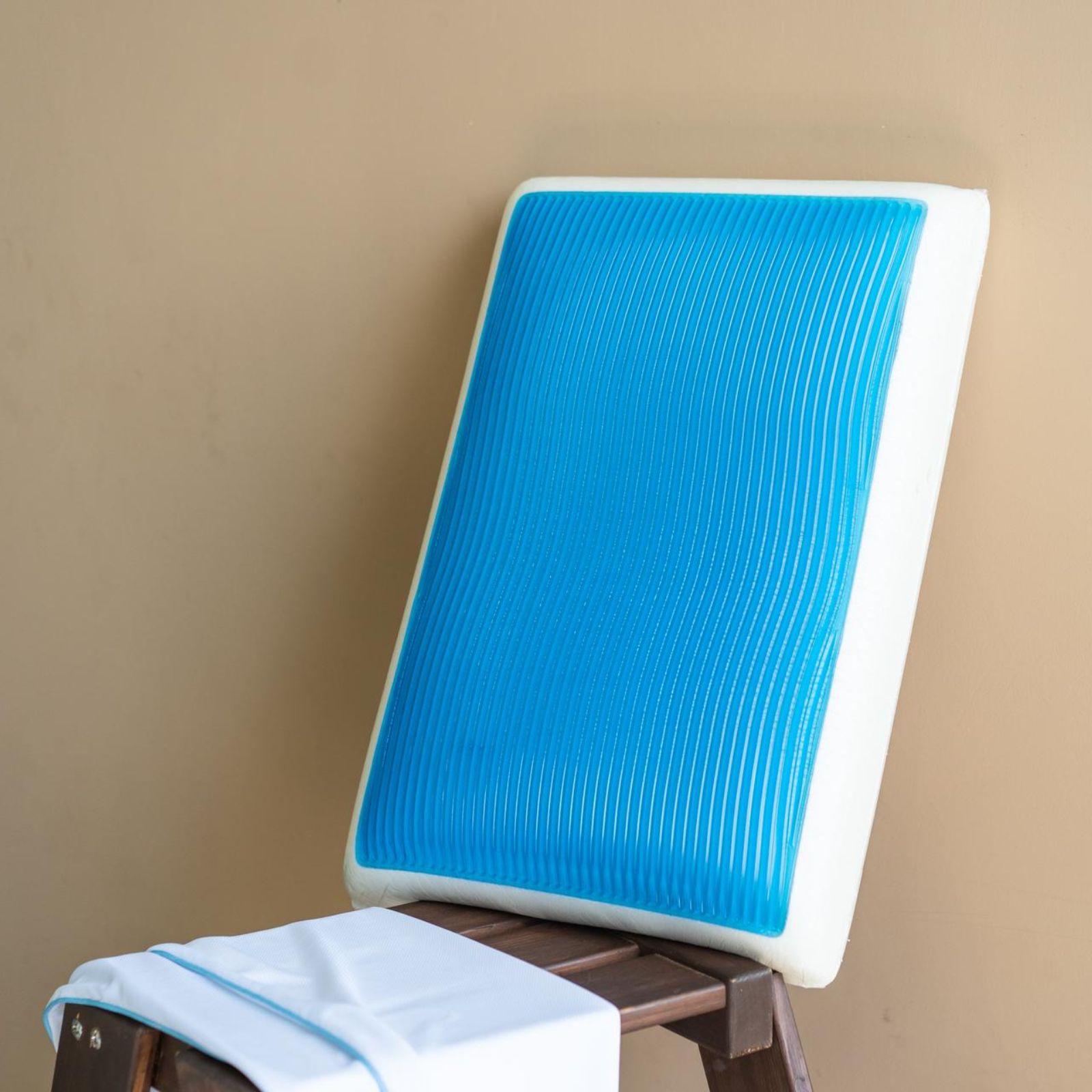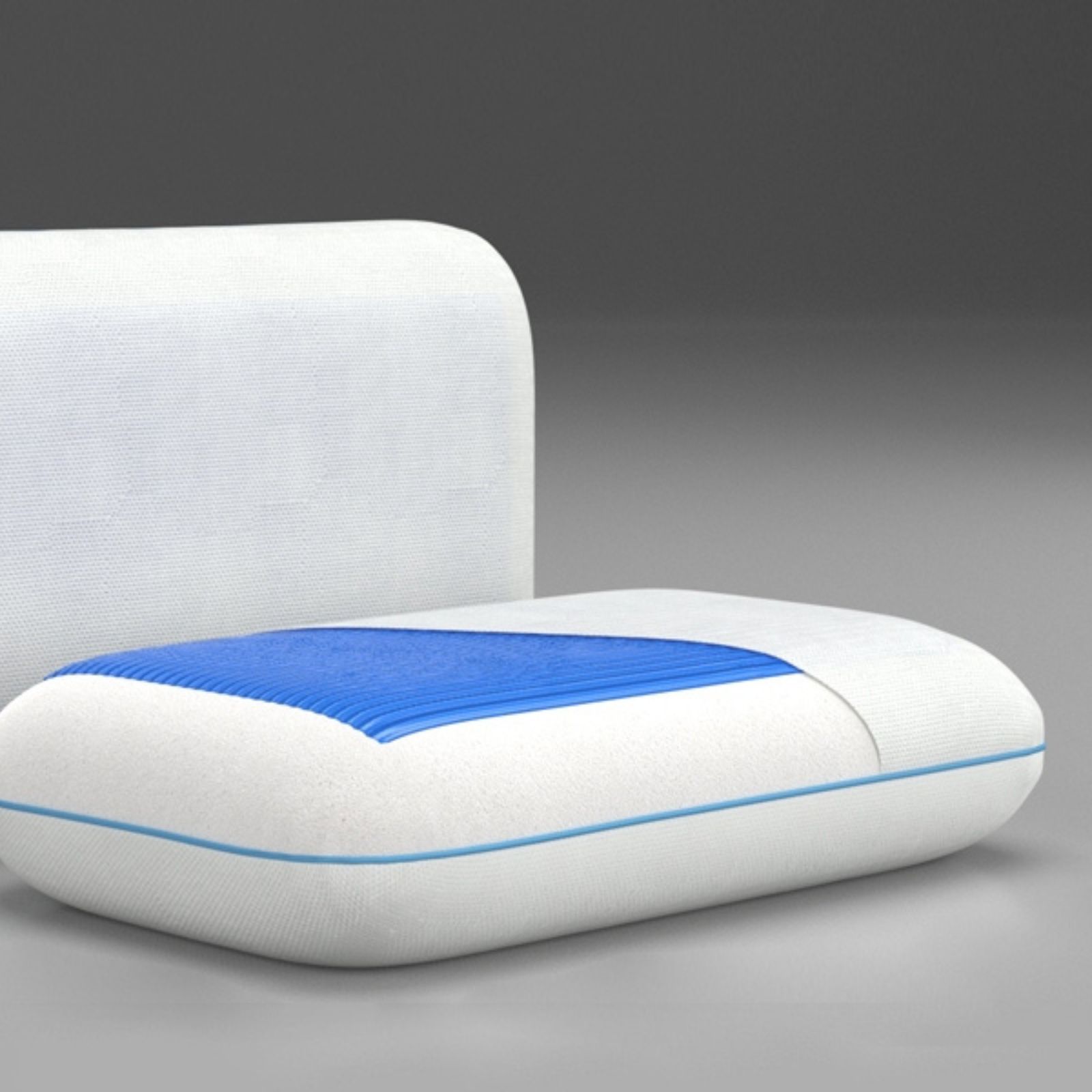 Stratul Ecogel este situat pe o parte a pernei, pe cealata avem spumă cu memorie. Suprafața undelor albastre în relief relaxează delicat mușchii feței, oferind un efect ușor de masaj.